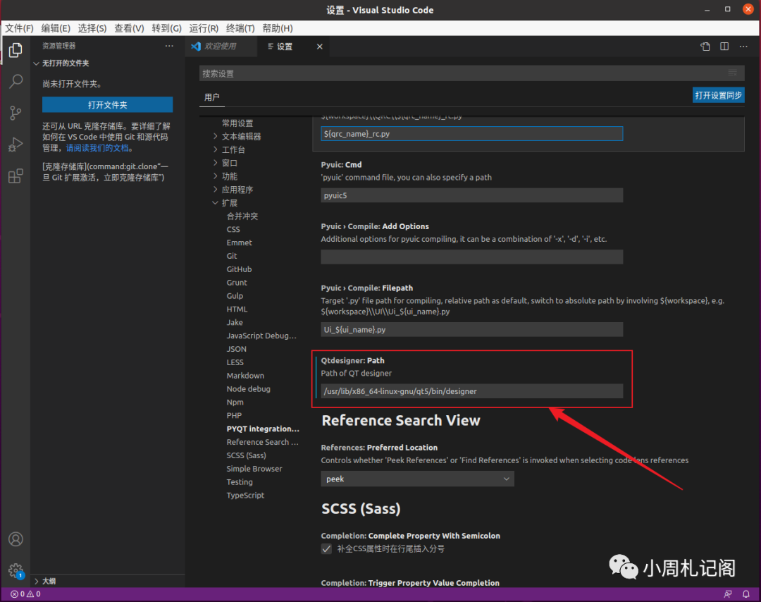 在设置中找到Pyqt-integration扩展设置,Pyqt-integration > Qtdesigner:path