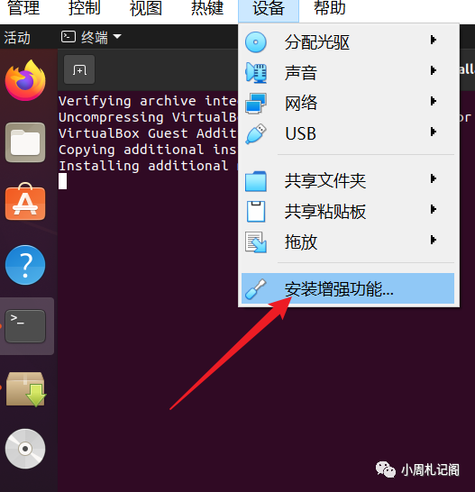 点击菜单栏选项选择”设备——安装增强功能“安装Virtualbox增强功能。