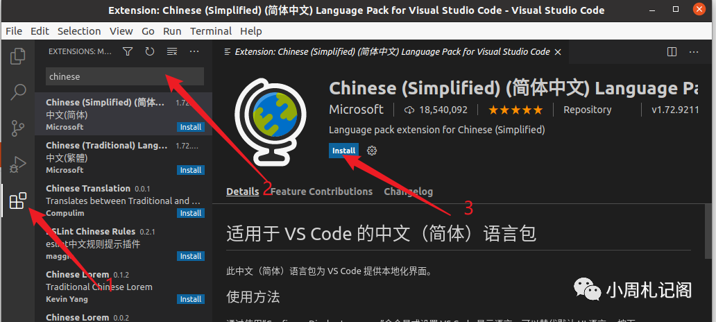 打开软件后,在扩展商店里搜索Chinese,选择简体中文语言包,下载安装重新启动VS Code即可中文简体设置成功。