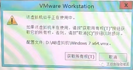 我这边的问题都是在电脑非正常关机,电脑重新启动以后出现的。具体现象是,重新打开虚拟机后出现下面的画面,提示“该虚拟机似乎正在使用中。如果该虚拟机未在使用,请按“获取所有权(T)”按钮获取它的所有权。否则,请按“取消(C)”按钮以防损坏。配置文件: D:\AB虚拟机\Windows 7 x64.vmx”。