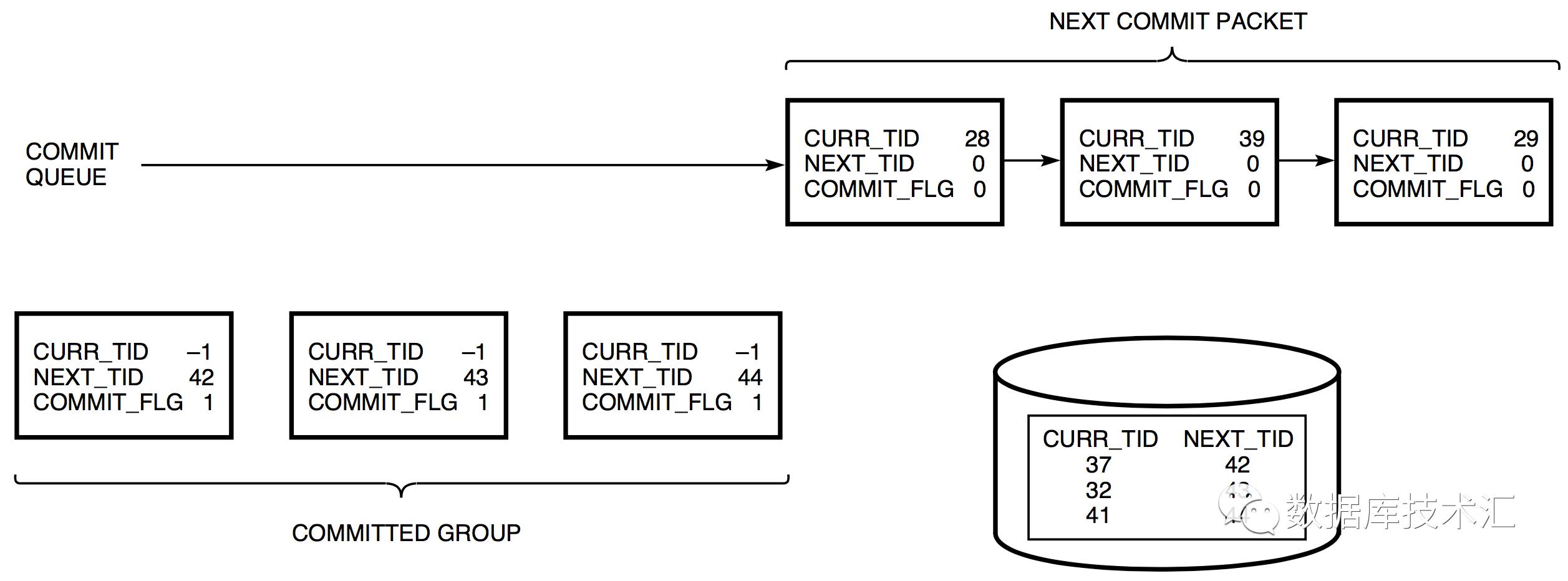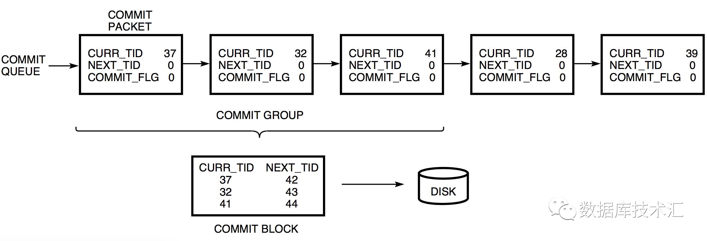 3. Group Committer扫描Commit Queue,通过每一个Commit Packet(Group提交请求)中包含的信息来构造一个Commit Block,其中包含本次Group Commit要提交的事务(构造Commit Block的过程是一个不断扫描Commit Queue的过程,一方面是因为不断有新的请求加入进来,另一方面是因为Group Committer需要判断是否满足Group Commit的条件,比如累积的事务是否足够等)。Commit Block中维护一个事务是否已经被提交(为了最终完成一个事务的提交,需要把Commit Block中的Commit Flag修改成1),上图中表示一个已经准备就绪的Group。作为一种优化,Commit Block中也维护了每一个线程将要处理的下一个事务ID,这样当本次Group Commit完成后,对应的线程可以快速地处理下一个事务。