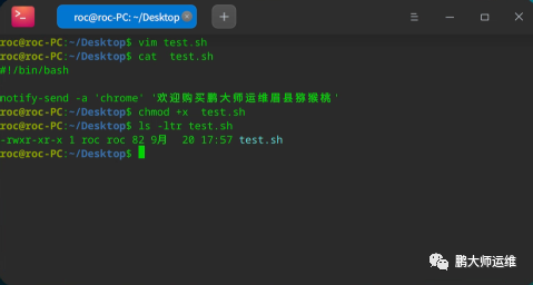 首先编写test.sh文件,此脚本的作用是通过chrome浏览器输出“欢迎购买鹏大师运维眉县猕猴桃”