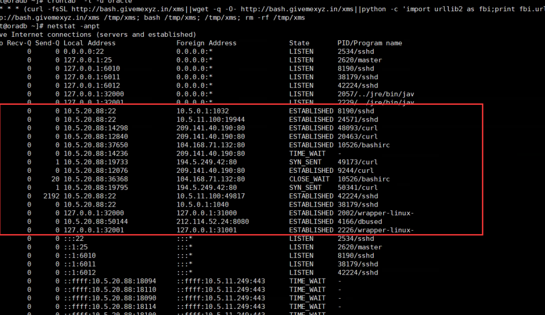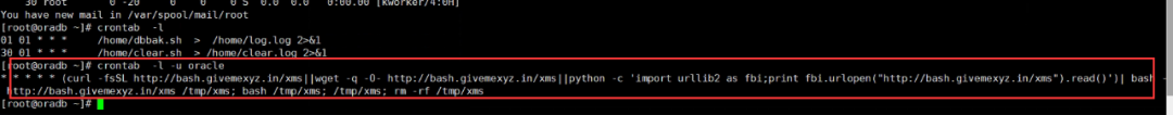 5、通常具备定时任务以及恶意命令植入常用命令,定时触发或使用某个被替换的命令恶意程序反复重启,如下图。