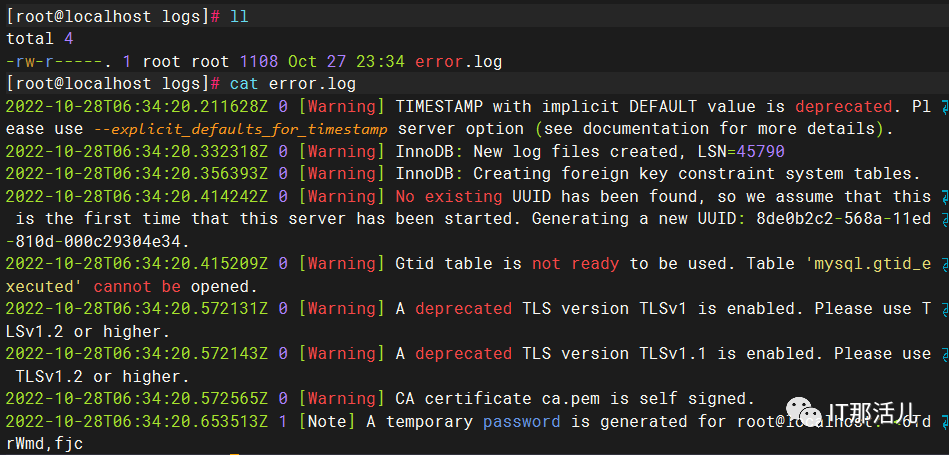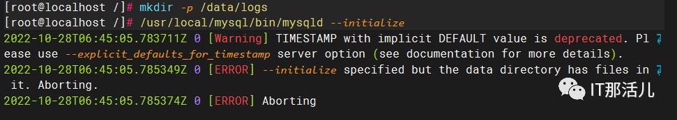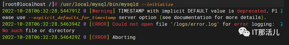 1. datadir参数用于数据库初始化时指定数据文件存放位置。log_error指定错误日志名及其存放位置。初始化测试,datadir=/data,log_error=/data/error.log,初始化成功并自动创建了/data文件夹。/data/error.log记录初始化生成的临时文件。日常生产环境中,需要将日志与数据分开文件夹保存,有利于日常运维管理。示例测试datadir=/data,log_error=/logs/error.log。提示错误Could not open file,实际情况是/logs文件夹不存在,创建/logs文件夹重新初始化。初始化成功并在error.log中生产随机密码。综上所述,初始化会自动生成数据目录,配置文件中指定日志文件存放位置不会自动生成,需要在初始化之前提前创建好。2. 接下来说一下遇到过的一次特殊情况。将日志存放在数据目录下的文件夹中。示例测试datadir=/data,log_error=/data/logs/error.log。经过了上一次的测试我们知道了日志存放位置需要存在,否则初始化将失败。创建/data/logs/目录之后在初始化看看会发生什么。初始化失败,这是因为初始化时需要数据目录为空。查看官方文档,从MySQL 5.7.11开始,如果每个条目的名称都以句点(.)开头或使用--ignore-db-dir选项命名,则允许现有数据目录为非空。下面我们来测试一下。将/data/logs改为以(.)开头的隐藏文件,修改datadir地址为/logs,查看初始化结果。初始化成功,并且在/logs目录下生成错误日志。这说明数据文件下除了以(.)开头的隐藏文件之外不能有其他内容。--ignore-db-dir选项自MySQL5.7.16以来一直被弃用,所以这种方法也不适用。经笔者验证一个方法,初始化成功之后修改配置文件日志文件位置如log_error =/data/logs/error.log,将初始化后的/logs/error.log移动到/data目录下,启动MySQL服务不会报错,最后测试配置文件中日志所在位置与实际位置相符就不会报错。可以在新建数据库的时候采用此方法来修改日志文件位置。综上所述,MySQL初始化时数据目录下只能放以(.)开头的隐藏文件,存放日志文件的目录必须存在。