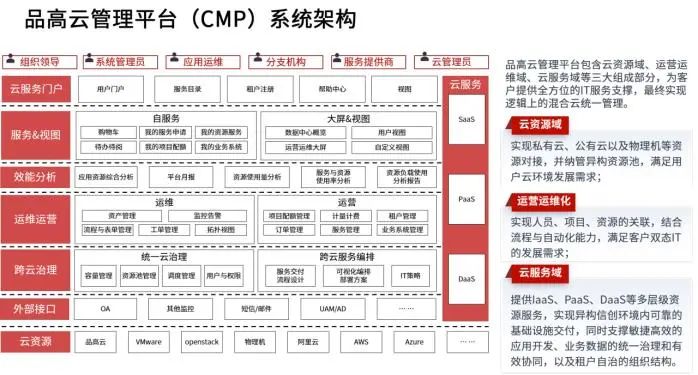基于此,品高股份自主研发的一站式混合云运营运维管理平台产品——品高云管理平台( BingoCMP )作为面向企业 IT 管理部门的多云运营运维管理平台,能够为整体云资源与服务的规划、建设、交付、使用、回收等全生命周期提供运营和运维保障。