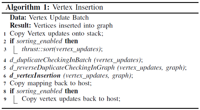 实际的图数据分别存储在点存储块和页存储块中。所有的点存储块的结构和大小相同,根据其在GPU端的标识符连续存储,构成一个动态增长的列表。新的点插入时,要么重用已被删除的结点,要么在列表的最后进行追加,不会触发在列表中间的删除和内容的移动。因此,通过使用原子的fetch-and-add操作为新插入的点赋予唯一的标识符即可实现上述操作。下图为点插入的伪代码。对即将执行插入操作的一批点,faimgraph系统首先将其根据标识符进行排序,排序的目的主要是进行一个批次内部的去重操作。同时,还需要对图数据中原有的点与即将插入的点进行比较。在这里作者提出了名为反向检查的优化。对图数据中原有的点与即将插入的点进行去重时,一般的逻辑为将即将插入的点作为搜索目标,在已有的点中进行搜索。而作者认为已有的点的数目远远多于即将插入的点的数目,这时单次搜索操作的耗时过长且负载不均衡。作者的解决方案是反其道而行之,将已有的点作为搜索目标,在即将插入的点中搜索。由于不同的点的搜索可以并行,作者此时实际上是通过提高并行度来弥补搜索次数的增加。