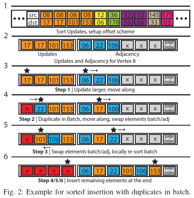 边数据的更新同样遵循类似的逻辑。如下图所示,首先对同一批次中的边进行排序,排序后检是否有重复的边,将重复的边去除后,开始实际的插入过程。每个线程处理一个点的邻居列表的插入。插入时的逻辑类似于归并排序,通过维护两个指针分别指向待插入的边表和原有的邻居列表,比较指针指向的元素的大小,根据大小关系移动元素或者指针。