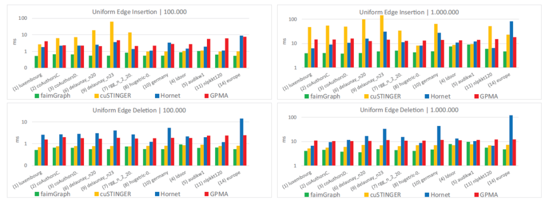 接下来介绍faimgraph的实验部分。首先是对不同批次下纯插入/删除的批次的性能比较。作者选取了cuSTINGER、Hornet与GPMA三个此前的系统进行比较。批次大小选择了100和1000两种。在绝大部分的数据集中faimgraph均取得了优势,性能提升2倍至10倍不等。并且在更新批次更大时,其性能优势更加显著。另外注意到cuSTINGER系统在不同数据集上的性能差距非常大,这主要取决于其是否触发了数据结构的重组操作。与之相比,faimgraph的表现在不同数据集上较为稳定。