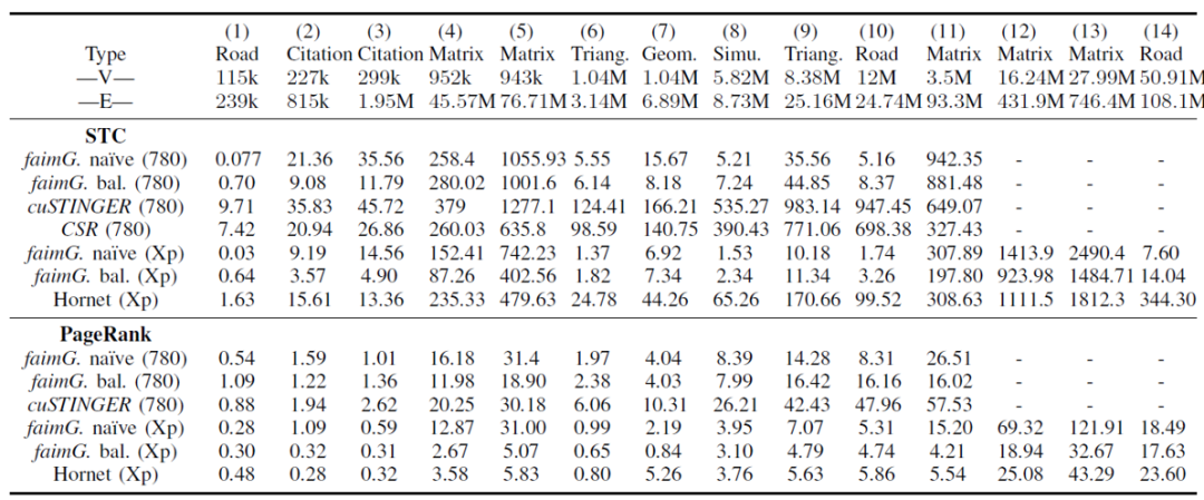 faimgraph的作者还比较了在不同的DGM系统上运行两种算法:三角形计数(Static Triangle Counting)和PageRank算法时的执行性能。可以看到在所有的数据集上faimgraph的性能都超过了先前的工作。并且在三角形计数这一算法上优势更加明显。