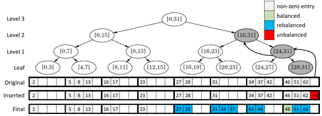 首先我们简单介绍PMA的原理。PMA是一种用于维护动态数组的数据结构。经典的顺序存储的数组在执行插入时需要移动插入位置之后的元素,产生大量额外开销。一种解决方案是在数组中预留出容纳插入元素的空位,PMA便是遵循这种思路,并且用一个平衡二叉树结构来维护这些空位。PMA首先将数组划分为等长的块,每个块中容纳元素的比例必须处于两个阈值之间,当这个比例不属于两个阈值之间时时,会沿平衡二叉树中的路径寻找连续的存储块,然后重新组织这些存储块中的元素,使得每个存储块中的容纳元素比例都符合阈值。如下图所示,在往数组中插入48以后,最后一个存储块的存储比例超过了阈值,这时,需要在平衡二叉树中往上搜索一层,找到最后两个存储块,发现仍然无法使得每个块都符合要求,因此还要再往上搜索一层,找到最后四个存储块,可以通过重新分配元素使得每个存储块中的存储元素比例都符合要求。