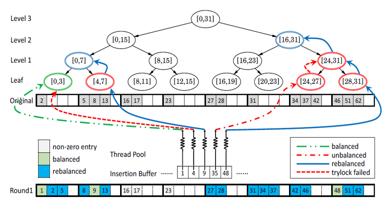 上述GPMA方案的问题有:第一,多个线程在访问时读取的数据不连续,无法利用GPU中访存合并的优化。第二,争抢锁的开销过大。第三,锁的争抢与随机的内存读取使得线程之间的工作负载不均衡且难以预测。为了解决上述三个问题,此文作者又提出了GPMA+方法。