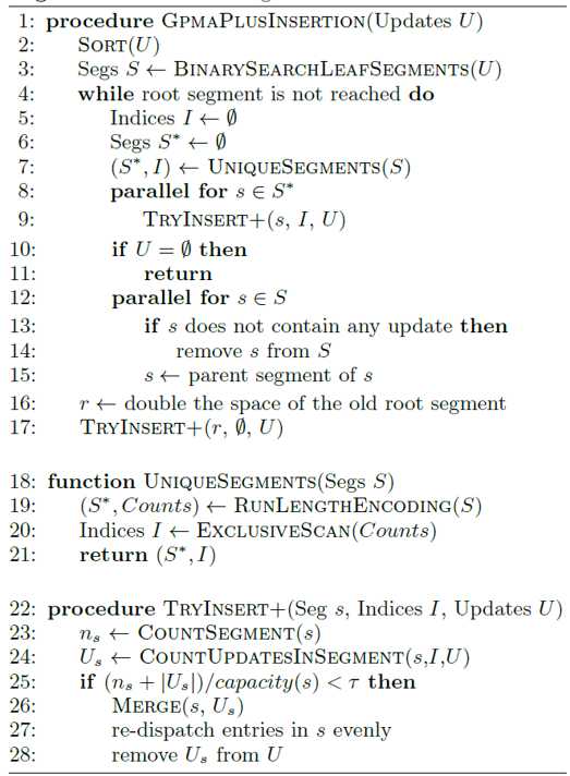 第二篇工作为来自新加坡国立大学的研究人员发表于SIGMOD2017的《Accelerating Dynamic Graph Analytics on GPUs》。其主要贡献为将一种自平衡的数据结构Packed Memoery Array(PMA)引入了GPU上的DGM系统中,为其设计了并发的更新机制,并探讨了如何将其与图算法进行结合。