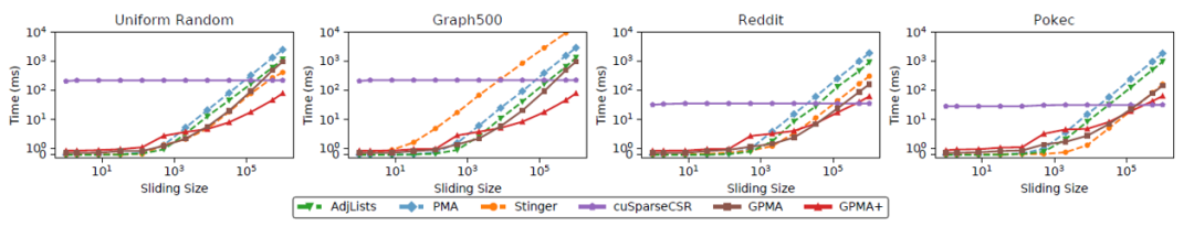 在实验中,GPMA和GPMA+方法在边更新操作、BFS、Connected component以及Pagerank算法中都取得了提升。