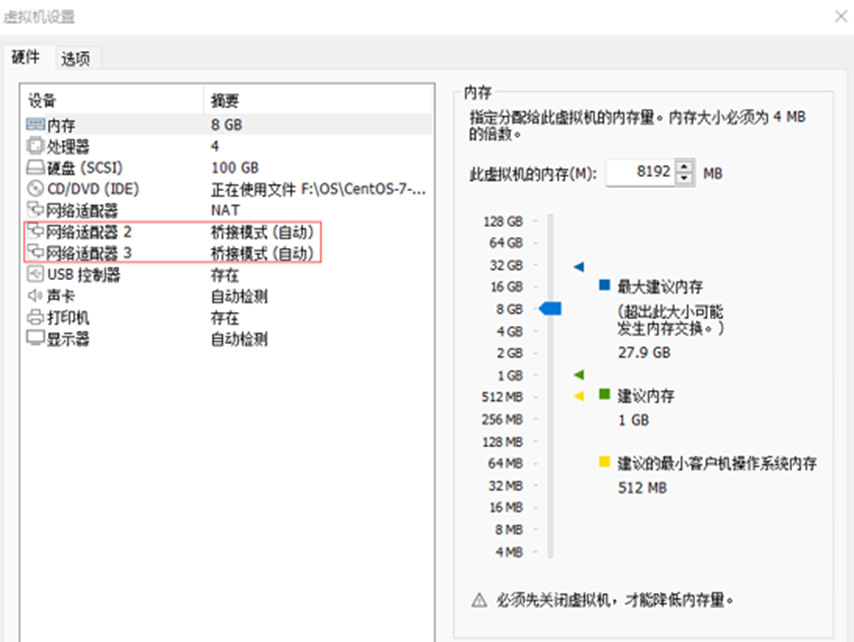 添加2块桥接模式的网卡,加上此前网卡共3块网卡.