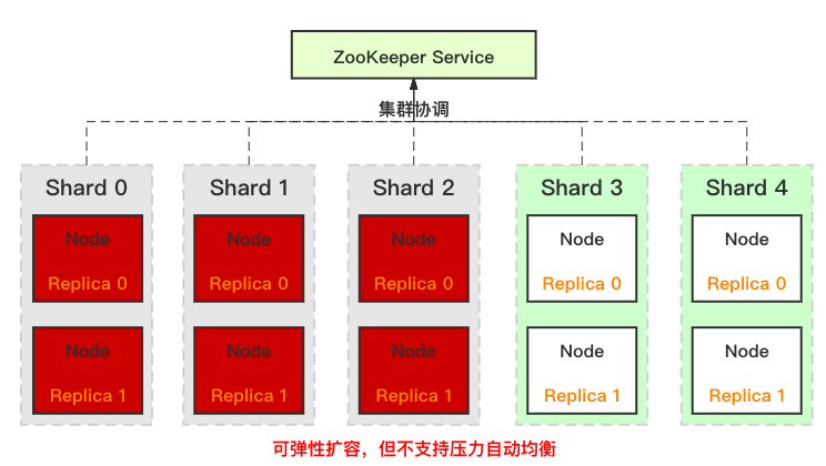 ClickHouse在弹性伸缩方面的不足,大幅增加了业务在进行水平伸缩时运营压力。基于 ClickHouse 的当前架构,实现自动均衡相对复杂,导致相关问题的根因在于 ClickHouse 分组式的分布式架构:同一分片的主从副本绑定在一组节点上。更直接的说,分片间数据打散是按照节点进行的,自动均衡过程不能简单的搬迁分片到新节点,会导致路由信息错误。