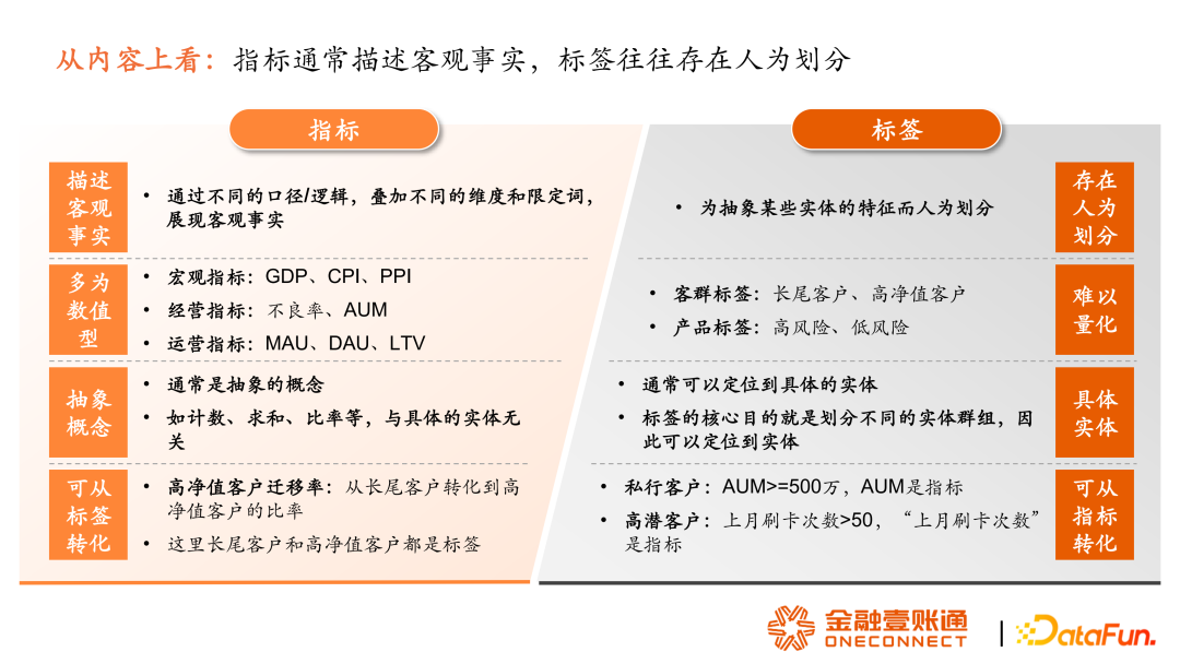 从内容上看:指标通常描述客观事实,标签往往存在人为划分。