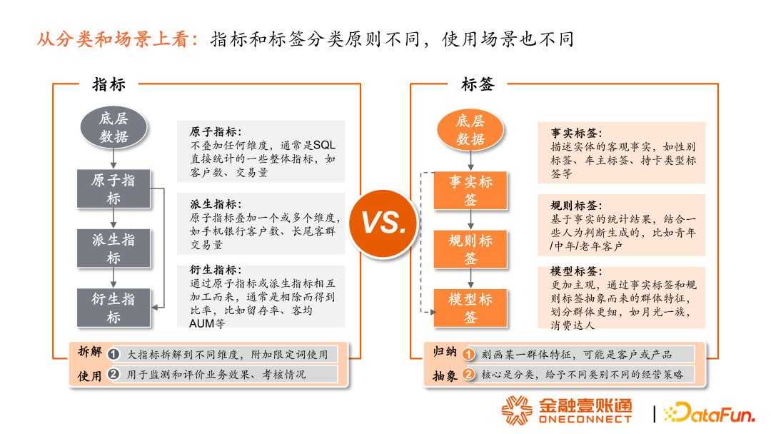 从分类和场景上看,指标和标签的分类原则不同,使用的场景也不同。