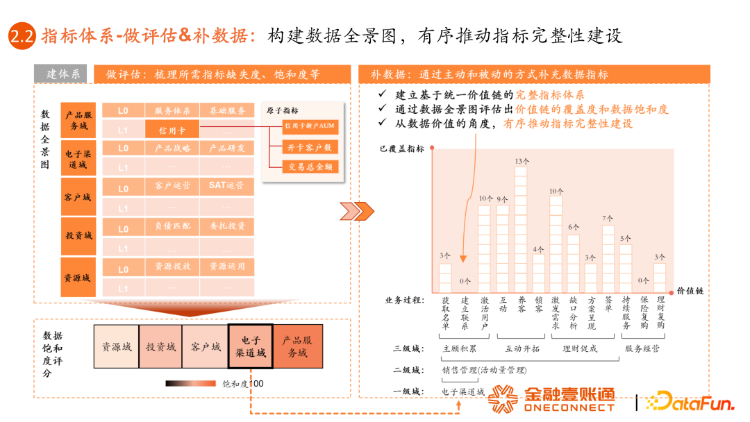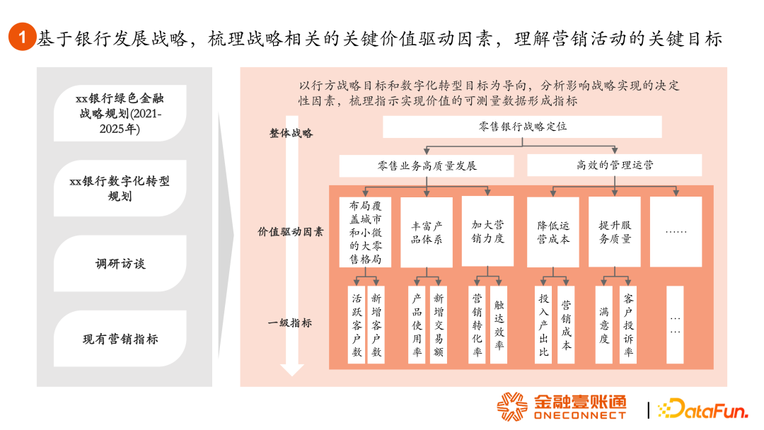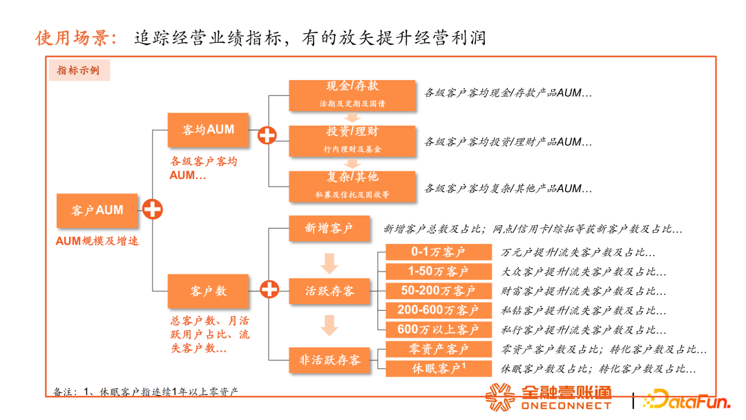 具体举例说明:指标体系通常会首先定义一个或几个北极星指标,比如招商银行常年使用 AUM 作为北极星指标,将北极星指标拆解到现金/存款、投资理财或其他业务模块,同时用户也可以拆解为活跃用户和非活跃用户等。以此基础可以梳理出整体的指标框架,从而指导业务。