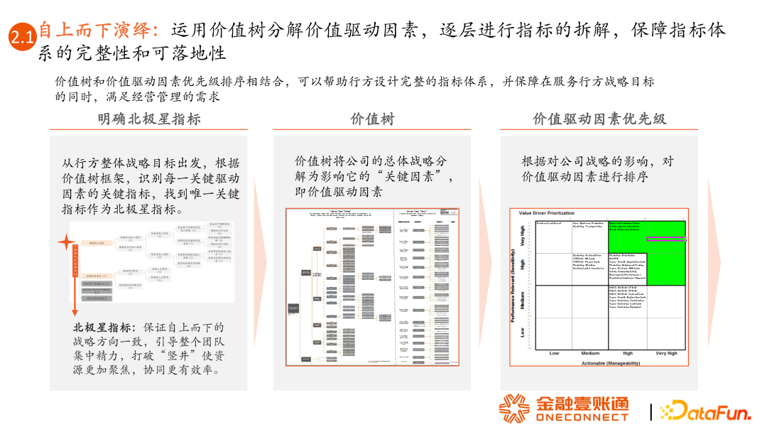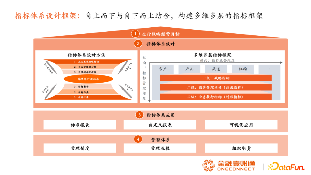比如零售今年提出了要发展高效的运营,如何理解具体包括哪些要素,如何布局等都可以成为指标梳理的逻辑,并通过价值驱动因素梳理成为一级指标。这是自上而下,随后会构建一个多维多层的框架以及对应的应用和管理体系。