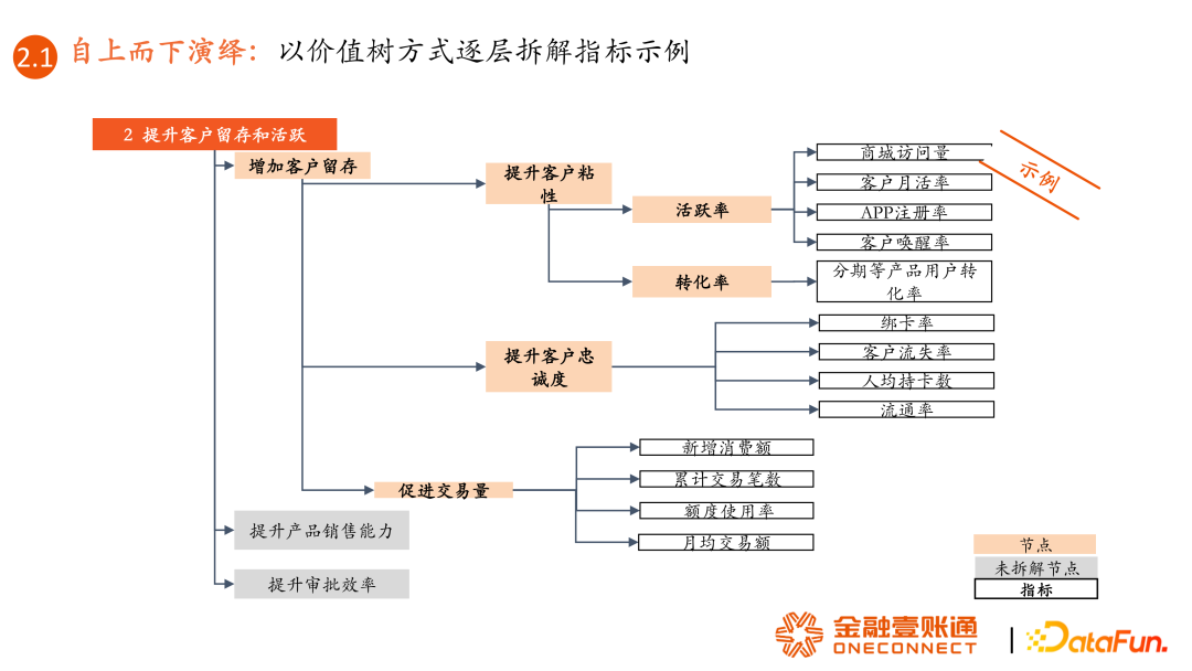 比如提升客户的留存活跃的宏观指标,可以拆解为提升留存、提升产品销售能力和提升审批效率等等。提升客户留存,又可以分为增加客户粘性和忠诚度,或是促进交易量,一步一步细分就可以得到一些具体的经营指标。这样的好处是底层的指标一定能够支撑大的目标。