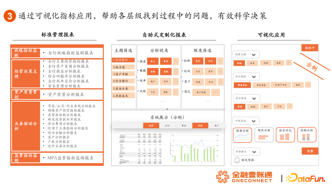 指标的定义也是需要标准和规范的,与底层的数据规范、数据标准是一致的。需要有业务属性、技术属性和管理属性。业务属性能够定位指标的唯一识别编号,指标的名称、指标的含义以及业务口径等等。技术属性需明确指标在系统中的字段名称、数值类型以及指标的统计口径等等。管理属性最重要的是指标的分类及其属主部门,也就是哪个部门需要对指标负责,当指标出现波动和出入时可以进行核验。数据可视化包括标准化的管理报表,以及自助式的数据看板,通过拖拉拽形成动态的数据报表。