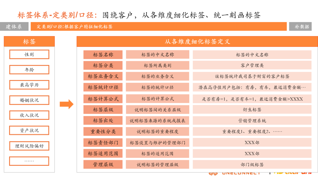 标签体系的核心是以整个业务经营为目标,因为标签需要在实际一线营销中应用,所以最好从业务的实际目标出发去梳理标签的需求。同指标体系相同,有固定的形式和属性,并且需要定义完整的标签管理机制。同指标类似,例如名称、含义和口径等等都需要标准化的定义。