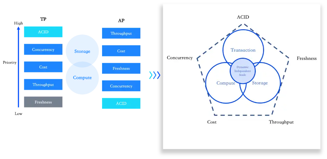 具体来说,用户对于 TP 和 AP 数据库系统的需求基本可以归纳为以下五点:ACID,并发性能,吞吐,成本和数据新鲜度。HSTAP 数据库若想兼容以上能力,实现起来却没那么容易,由于高并发、短时延的 OLTP 负载与带宽密集型、高时延的 OLAP 负载的访问模式不同且它们互相干扰,把他们融合到一个系统里存在很多的冲突点。