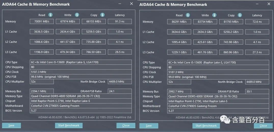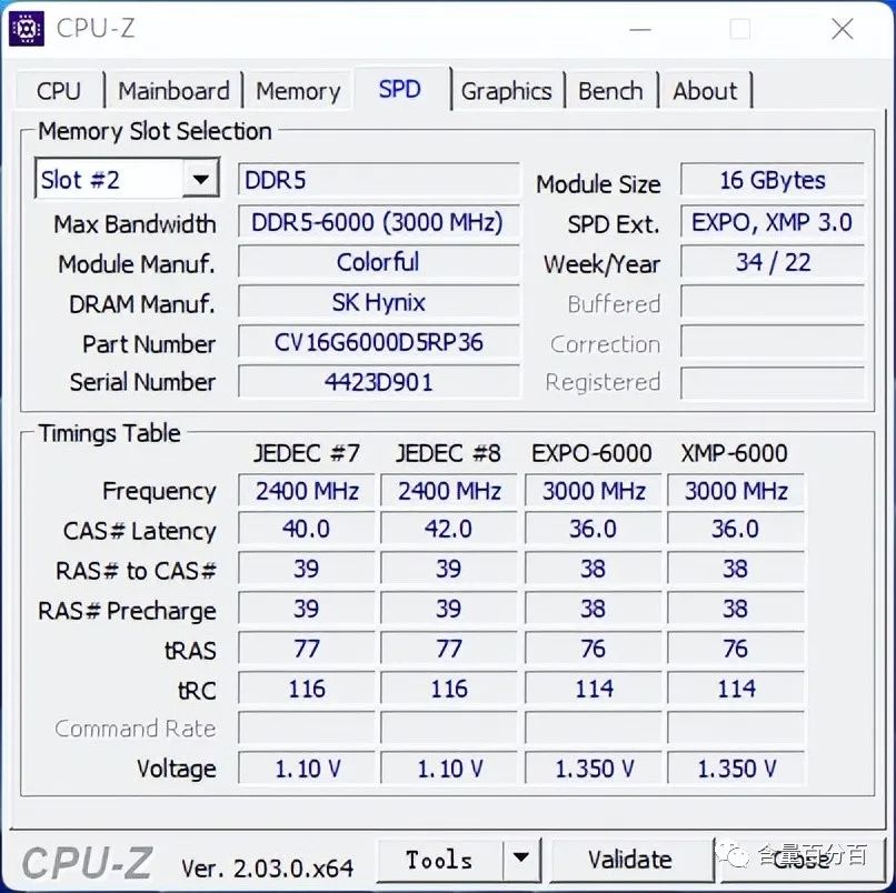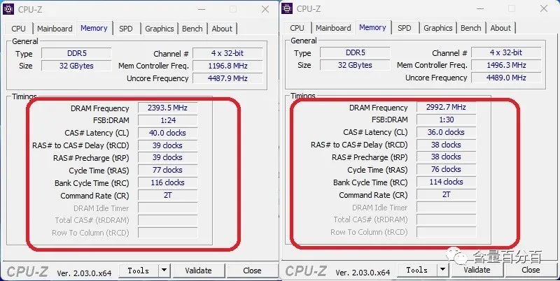 默认模式下的DDR5频率为4800MHz,这是DDR5内存的起步频率,时序为CL40即40-39-39-77,手动一键开启XMP后则会自动超频至6000MHz,对应时序变为了CL36即36-38-38-76,比部分采用海力士颗粒的同类型DDR内存时序要低一些。