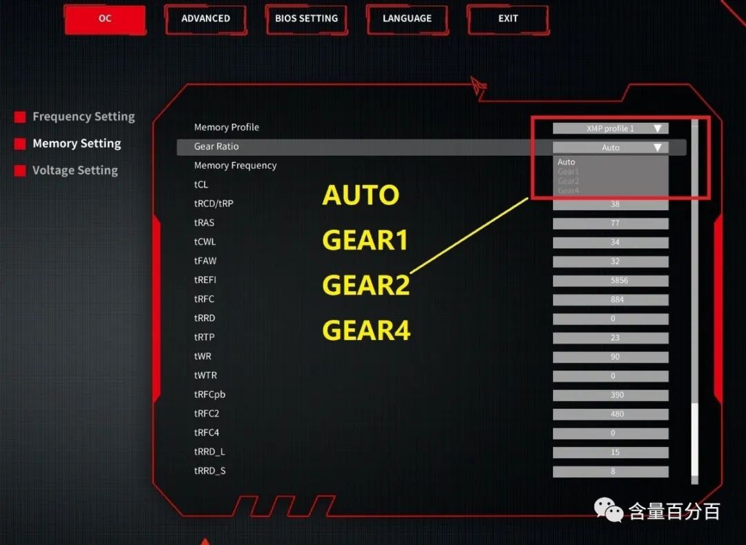 在DDR5主板对应内存设置的Gear Ratio选项中,我们一般可以看到AUTO、Gear2和Gear4的选项,Gear1可能会出现在列表中,但不能直接选择使用,因为会无法正常开机。所谓的Gear模式其实指的就是CPU的内存控制器与内存频率的比例关系,影响Gear模式的因素主要就是内存控制器的极限频率和CPU的SA电压。一般来讲,Gear 1模式被称为内存同频(同步)模式,Gear 2和Gear 4模式称为内存分频(异步)模式,DDR4内存对应的是Gear 1模式和Gear2模式,DDR5内存对应的是Gear 2模式和Gear4模式。在实际使用中,如果不涉及手动超频的话,一般选择预设的AUTO模式即可。