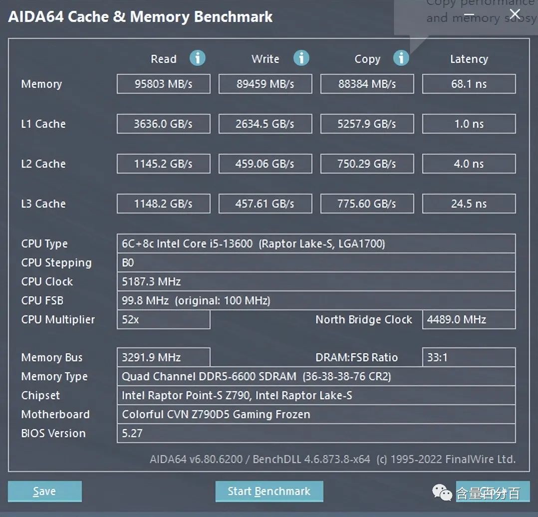 对应的性能表现方面,这里搭配AIDA64进行测试,可以看到内存读取性能提升到了95803MB/s,写入性能提升到了89459MB/s,拷贝性能提升到了88384MB/s,而延迟则是缩短到了68.1ns,整体性能提升明显。