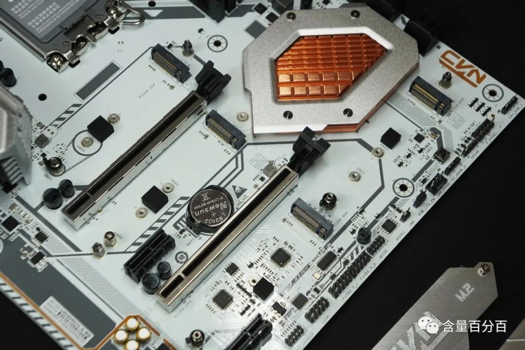 主板是CVN系列的ATX规格主板七彩虹冰霜大板CVN Z790 D5 GAMING FROZEN 巡洋舰,它延续了前代CVN Z690D5 GAMING FROZEN V20的设计风格,整体以白色为主,搭配I/O散热装甲和PCH散热片这两个位置的镀铜工艺处理,色彩搭配让七彩虹冰霜大板CVN Z790 D5 GAMING FROZEN 巡洋舰的辨识度很高。七彩虹Z790 D5巡洋舰提供了四个PCI-E 4.0规格的M.2 NVMe接口,四个M.2 SSD插槽的设计极大的满足了用户扩容以及读写性能方面的双重需求,同时搭配散热金属片有效避免了发热问题导致主机性能不佳、死机和系统不稳的困扰。