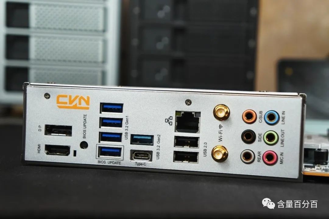 后窗I/O设计方面,七彩虹Z790 D5巡洋舰提供了1个USB 3.2 Gen 2x2 Type-C接口(20Gbps),提供了BIOS更新按键。接口方面包含了1个DP1.2接口、1个HDMI 2.0视频输出接口,4个USB3.2 GEN1接口和2个USB 2.0接口。有线网卡为瑞昱Realtek RTL8125 2.5G网卡,无线网卡为Intel WiFi 6 AX201,自带2个SMA天线接口,用户可以自行更换天线;音频方面提供了6个3.5mm不同类型的音频接口。