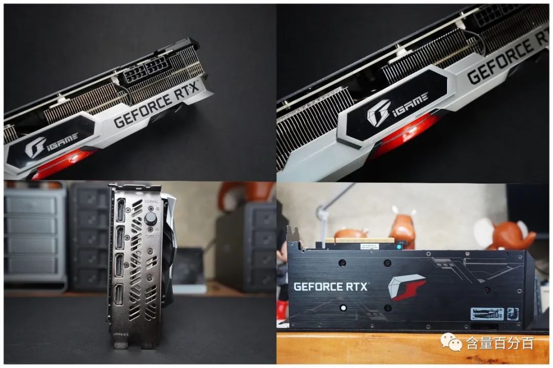 七彩虹 iGame GeForce RTX 3060 Advanced OC 12G L显卡在供电方面采用了2个8 PIN接口设计,能够为显卡提供持续稳定的电力输出。中央位置则是一块特色的显示屏,支持RGB灯光调节以及与主板、内存、散热器等硬件的灯光联动。接口部分提供了3个DP接口与1个HDMI接口,另外还提供了一个特色的OC键,可以实现一键超频。背面采用一体式金属背板,提升PCB 板强度的同时也能够起到辅助散热的效果。