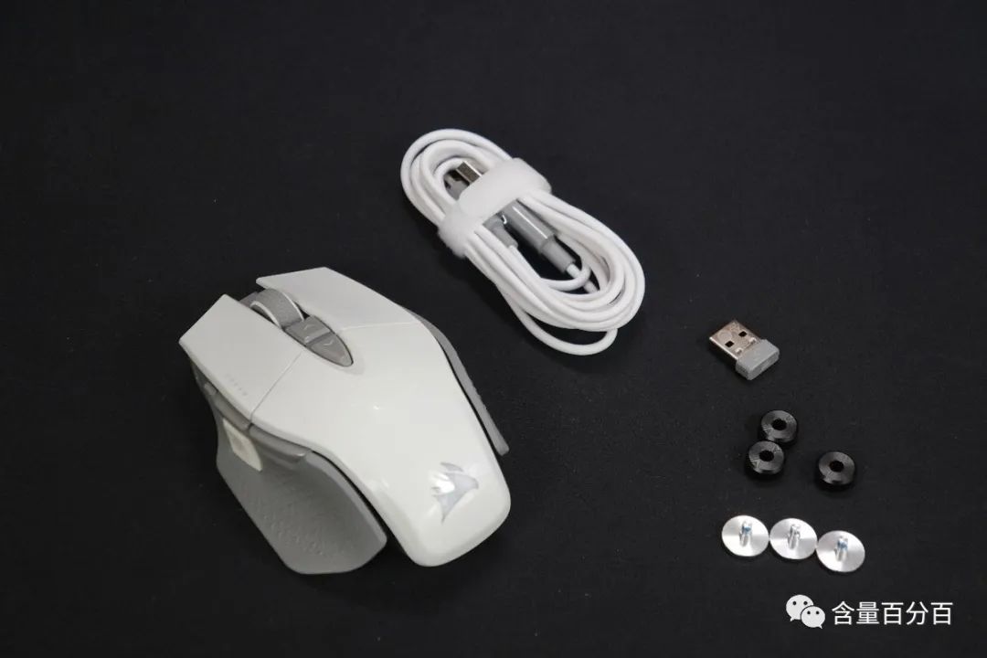 配件方面,随包装提供了1个M65 RGB ULTRA无线鼠标,1条白色USB A to C线材,3套配重和1个无线接收器。线材长度为1.8米,几乎可以满足不同桌面用户的使用需求。