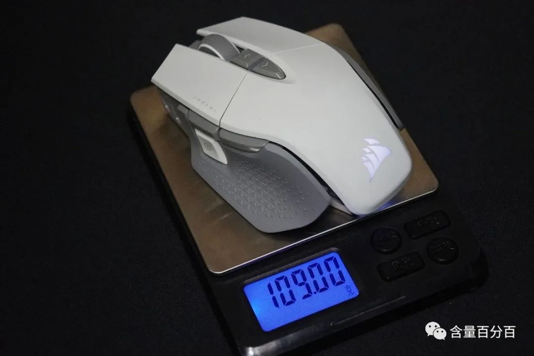 M65 RGB ULTRA无线鼠标采用右手人体工学造型设计,体积上属于中大型鼠标,鼠标实际称重是109克,相比于某些主打轻便的电竞鼠标来说要稍微重一些,但考虑到M65 RGB ULTRA无线鼠标采用的是铝制框架设计,那么这个重量也并不算太重。
