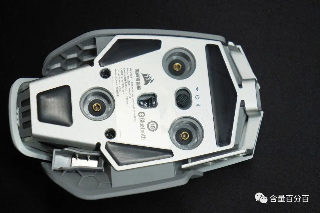 自由调节配重设计曾经流行过一段时间,算是中高端鼠标标配,我们可以通过加配重来进一步提升鼠标的稳定性,对FPS或是MOBA等竞技类游戏玩家来说尤为重要。M65 RGB ULTRA无线鼠标跟绝大部分同类型鼠标一样,将配重安装位设计在了底部,预留了三个孔位来方便玩家自由安装配重。顺便提一下,M65 RGB ULTRA无线鼠标采用的是PTFE脚贴,具备良好的低摩擦耐磨特性,数量就是上一中二下一共计四块,鼠标移动上比较顺滑流畅。