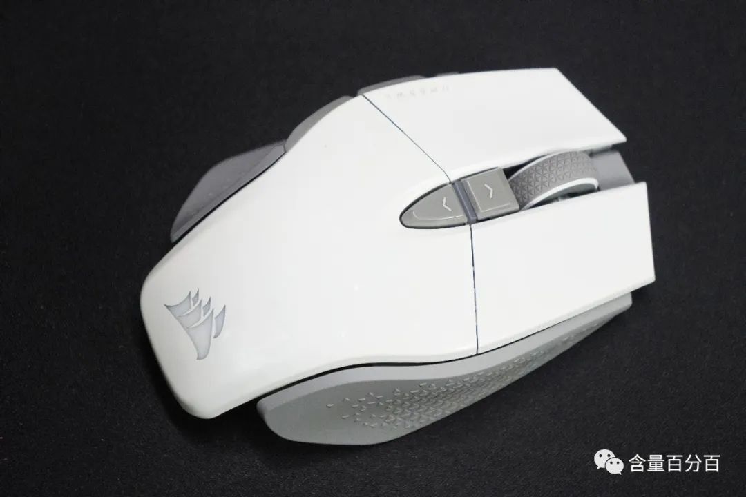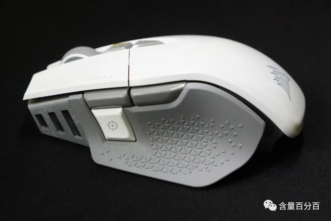M65 RGB ULTRA无线鼠标侧裙部分均采用了橡胶材质,搭配凸起的三角型图案来起到良好的防滑效果。