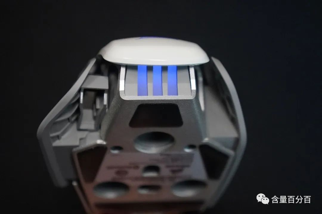 顶部除了滚轮外,还设计了两个DPI按键来快速调节DPI。滚轮个头略小,刻度感比较明显。滚轮采用常见的橡胶材质包裹,搭配表面排列整齐的凸点来起到防滑的效果。DPI按键手感清脆,键程略长但回弹力很足。到了这里咱们就来谈谈RGB灯光相关的部分,从下图可以看到滚轮并没有加入灯光设计,两个DPI按键中间设计有状态指示灯,同时尾部的logo加入了RGB灯光设计。