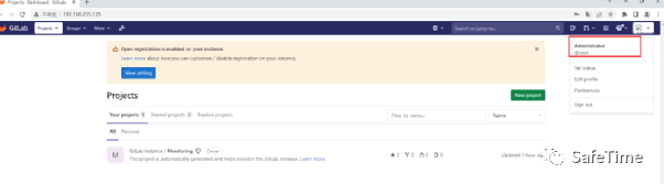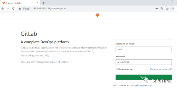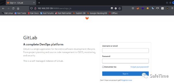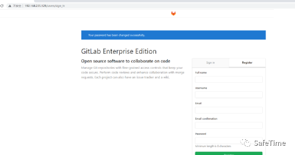环境运行后,访问http://192.168.235.129:8080即可查看GitLab主页,其ssh端口为10022,默认管理员账号root、密码是vulhub123456。