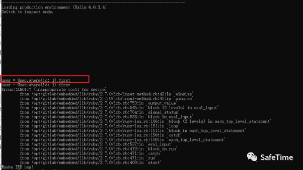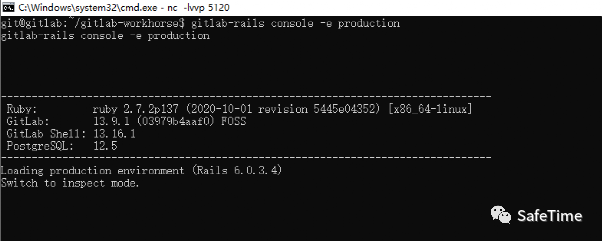 1. 这里网上说在强调需要root进入容器然后才能进控制台,我这边反弹的shell git用户权限也可以直接进入控制台。使用以下命令启动Ruby on Rails控制台