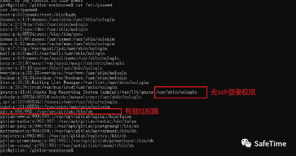 可以看到,这里的gti用户具有ssh登录权限,可以通过向git用户写入公钥进行登录。