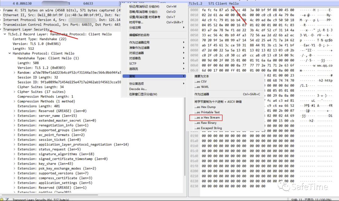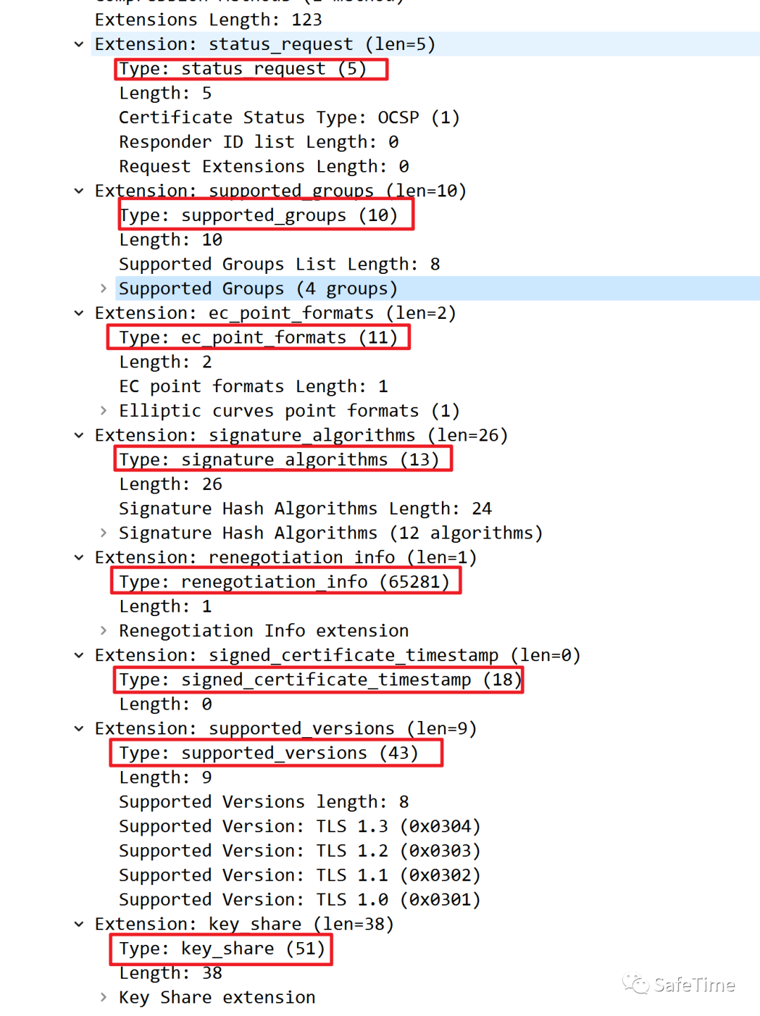 Client Hello数据包如下,ja3就是由以下圈出来的部分生成的