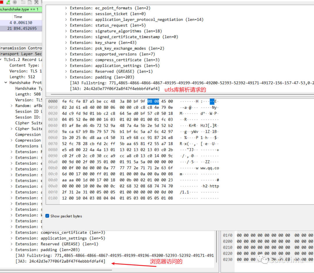 可以看到完全一致(wireshark好像3.6以上就支持ja3的指纹生成了)