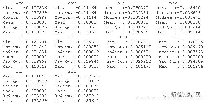 加载糖尿病数据集。这有关于糖尿病的病人水平的数据。数据为n = 442名糖尿病患者中的每个人获得了10个基线变量、年龄、性别、体重指数、平均血压和6个血清测量值,以及感兴趣的反应,即一年后疾病进展的定量测量。"