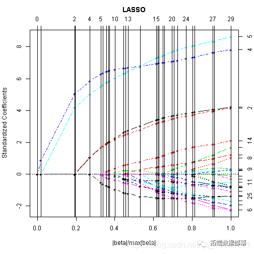 绘制x的每个变量系数与β向量的L1准则的路径。该图表明每个系数在哪个阶段缩减为零。