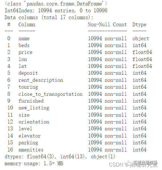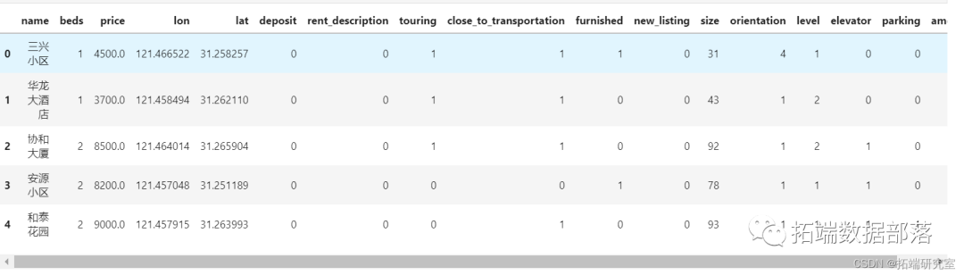 此数据来自 Lianjia.com.csv文件包含名称,租赁类型,床位数量,价格,经度,纬度,阳台,押金,公寓,描述,旅游,交通,独立浴室,家具,新房源,大小,方向,堤坝,电梯,停车场和便利设施信息。
