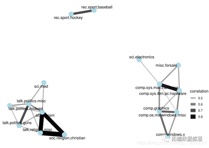 TF是词频(Term Frequency),IDF是逆文本频率指数(Inverse Document Frequency)。我们希望新闻组在主题和内容方面有所不同,因此,它们之间的词语频率也不同。