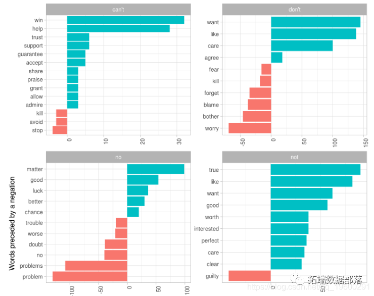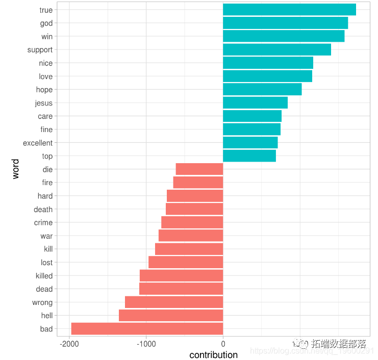 值得深入了解_为什么_有些新闻组比其他新闻组更积极或更消极。为此,我们可以检查每个单词的总积极和消极贡献度。