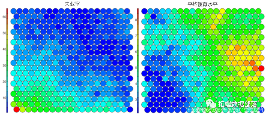 下图使用两个热图说明平均教育水平和失业率之间的关系。
